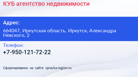 КУБ, агентство недвижимости по адресу 664047, Иркутская область, Иркутск, Александра Невского, 2 в дальнейшем Организация, размещена в следующих категориях: