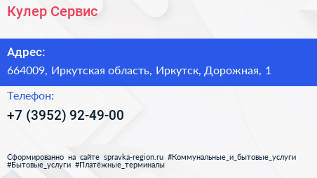 Кулер Сервис по адресу 664009, Иркутская область, Иркутск, Дорожная, 1 в дальнейшем Организация, размещена в следующих категориях: