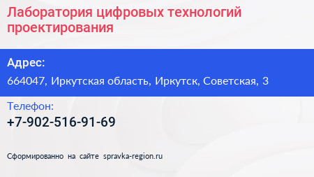 Лаборатория цифровых технологий проектирования по адресу 664047, Иркутская область, Иркутск, Советская, 3 в дальнейшем Организация, размещена в следующих категориях: