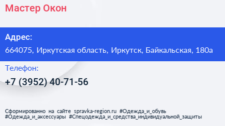 Мастер Окон по адресу 664075, Иркутская область, Иркутск, Байкальская, 180а в дальнейшем Организация, размещена в следующих категориях: