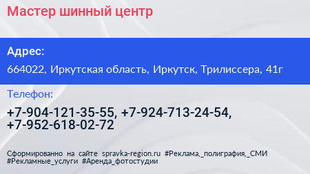 Мастер, шинный центр по адресу 664022, Иркутская область, Иркутск, Трилиссера, 41г в дальнейшем Организация, размещена в следующих категориях: