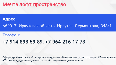 Мечта, лофт-пространство по адресу 664017, Иркутская область, Иркутск, Лермонтова, 343/1 в дальнейшем Организация, размещена в следующих категориях:
