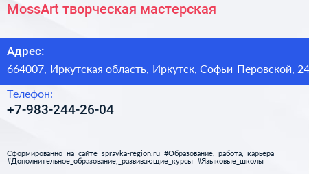 MossArt, творческая мастерская по адресу 664007, Иркутская область, Иркутск, Софьи Перовской, 24 в дальнейшем Организация, размещена в следующих категориях: