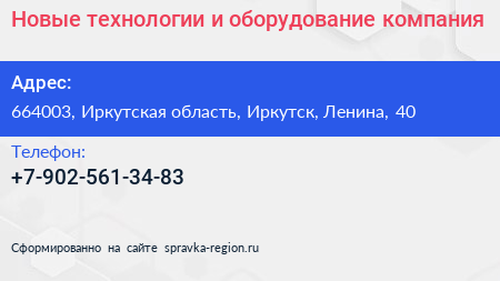 Новые технологии и оборудование, компания по адресу 664003, Иркутская область, Иркутск, Ленина, 40 в дальнейшем Организация, размещена в следующих категориях: