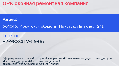 ОРК, оконная ремонтная компания по адресу 664046, Иркутская область, Иркутск, Лыткина, 2/1 в дальнейшем Организация, размещена в следующих категориях: