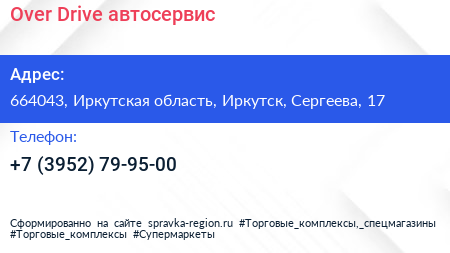 Over Drive, автосервис по адресу 664043, Иркутская область, Иркутск, Сергеева, 17 в дальнейшем Организация, размещена в следующих категориях: