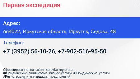 Первая экспедиция по адресу 664022, Иркутская область, Иркутск, Седова, 48 в дальнейшем Организация, размещена в следующих категориях: