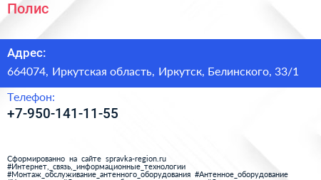 Полис по адресу 664074, Иркутская область, Иркутск, Белинского, 33/1 в дальнейшем Организация, размещена в следующих категориях: