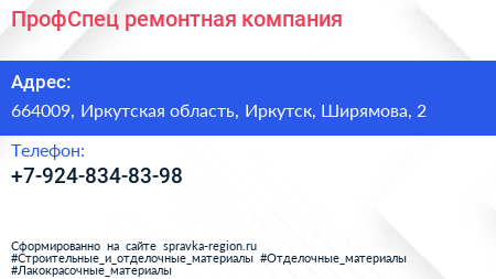 ПрофСпец, ремонтная компания по адресу 664009, Иркутская область, Иркутск, Ширямова, 2 в дальнейшем Организация, размещена в следующих категориях:
