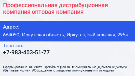 Профессиональная дистрибуционная компания, оптовая компания по адресу 664050, Иркутская область, Иркутск, Байкальская, 295а в дальнейшем Организация, размещена в следующих категориях: