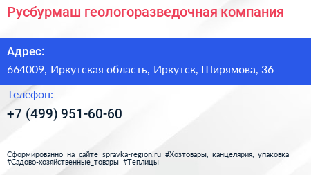 Русбурмаш, геологоразведочная компания по адресу 664009, Иркутская область, Иркутск, Ширямова, 36 в дальнейшем Организация, размещена в следующих категориях: