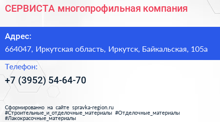 СЕРВИСТА, многопрофильная компания по адресу 664047, Иркутская область, Иркутск, Байкальская, 105а в дальнейшем Организация, размещена в следующих категориях: