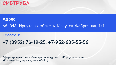 СИБТРУБА по адресу 664043, Иркутская область, Иркутск, Фабричная, 1/1 в дальнейшем Организация, размещена в следующих категориях: