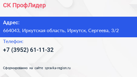 СК ПрофЛидер по адресу 664043, Иркутская область, Иркутск, Сергеева, 3/2 в дальнейшем Организация, размещена в следующих категориях: