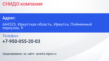 СНИДО, компания по адресу 664523, Иркутская область, Иркутск, Пойменный переулок, 9 в дальнейшем Организация, размещена в следующих категориях: