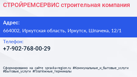 СТРОЙРЕМСЕРВИС, строительная компания по адресу 664002, Иркутская область, Иркутск, Шпачека, 12/1 в дальнейшем Организация, размещена в следующих категориях:
