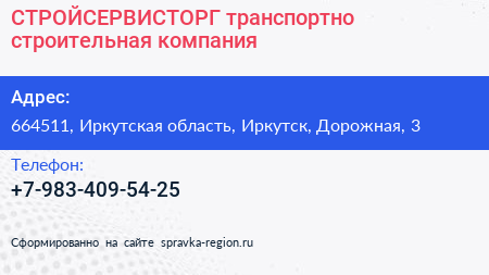 СТРОЙСЕРВИСТОРГ, транспортно-строительная компания по адресу 664511, Иркутская область, Иркутск, Дорожная, 3 в дальнейшем Организация, размещена в следующих категориях: