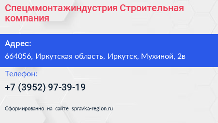 Спецммонтажиндустрия, Строительная компания по адресу 664056, Иркутская область, Иркутск, Мухиной, 2в в дальнейшем Организация, размещена в следующих категориях: