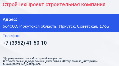 СтройТехПроект, строительная компания по адресу 664009, Иркутская область, Иркутск, Советская, 176Б в дальнейшем Организация, размещена в следующих категориях: