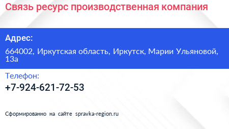 Связь-ресурс, производственная компания по адресу 664002, Иркутская область, Иркутск, Марии Ульяновой, 13а в дальнейшем Организация, размещена в следующих категориях: