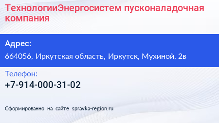 ТехнологииЭнергосистем, пусконаладочная компания по адресу 664056, Иркутская область, Иркутск, Мухиной, 2в в дальнейшем Организация, размещена в следующих категориях: