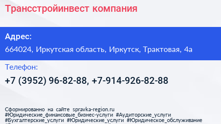 Трансстройинвест, компания по адресу 664024, Иркутская область, Иркутск, Трактовая, 4а в дальнейшем Организация, размещена в следующих категориях: