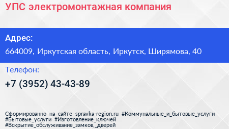 УПС, электромонтажная компания по адресу 664009, Иркутская область, Иркутск, Ширямова, 40 в дальнейшем Организация, размещена в следующих категориях: