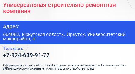 Универсальная строительно-ремонтная компания по адресу 664082, Иркутская область, Иркутск, Университетский микрорайон, 4 в дальнейшем Организация, размещена в следующих категориях: