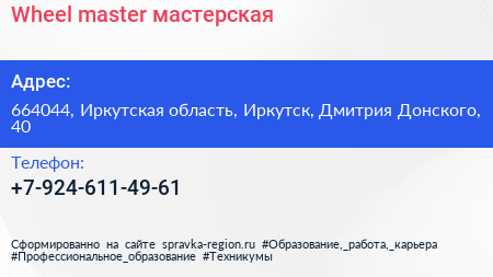 Wheel.master, мастерская по адресу 664044, Иркутская область, Иркутск, Дмитрия Донского, 40 в дальнейшем Организация, размещена в следующих категориях: