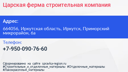 Царская ферма, строительная компания по адресу 664056, Иркутская область, Иркутск, Приморский микрорайон, 6а в дальнейшем Организация, размещена в следующих категориях: