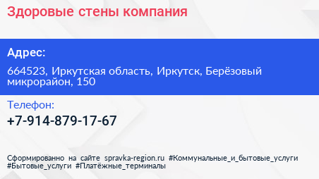 Здоровые стены, компания по адресу 664523, Иркутская область, Иркутск, Берёзовый микрорайон, 150 в дальнейшем Организация, размещена в следующих категориях: