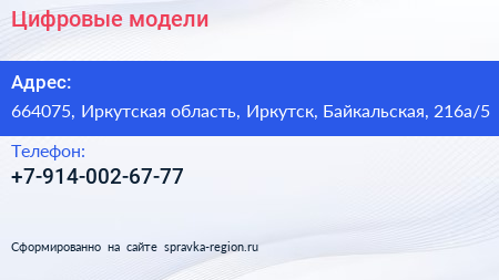 Цифровые модели по адресу 664075, Иркутская область, Иркутск, Байкальская, 216а/5 в дальнейшем Организация, размещена в следующих категориях: