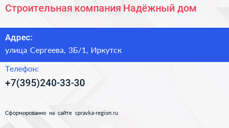 Строительная компания «Надёжный дом» по адресу улица Сергеева, 3Б/1, Иркутск в дальнейшем Организация, размещена в следующих категориях: