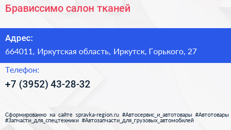 Брависсимо, салон тканей по адресу 664011, Иркутская область, Иркутск, Горького, 27 в дальнейшем Организация, размещена в следующих категориях: