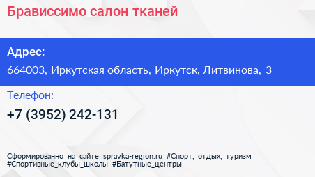 Брависсимо, салон тканей по адресу 664003, Иркутская область, Иркутск, Литвинова, 3 в дальнейшем Организация, размещена в следующих категориях: