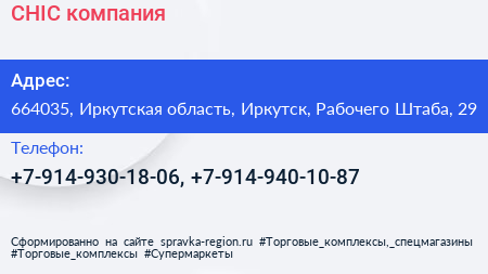CHIC, компания по адресу 664035, Иркутская область, Иркутск, Рабочего Штаба, 29 в дальнейшем Организация, размещена в следующих категориях: