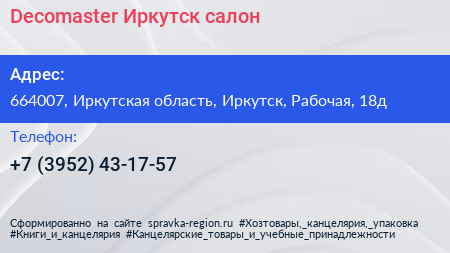 Decomaster Иркутск, салон по адресу 664007, Иркутская область, Иркутск, Рабочая, 18д в дальнейшем Организация, размещена в следующих категориях: