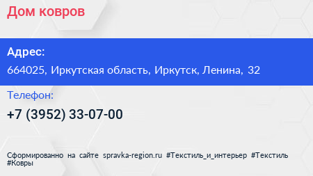 Дом ковров по адресу 664025, Иркутская область, Иркутск, Ленина, 32 в дальнейшем Организация, размещена в следующих категориях: