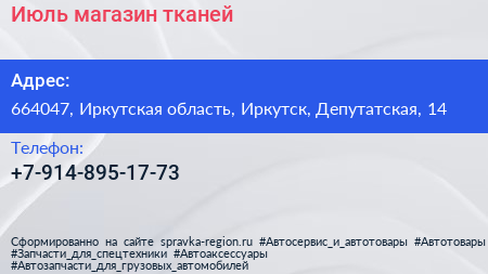 Июль, магазин тканей по адресу 664047, Иркутская область, Иркутск, Депутатская, 14 в дальнейшем Организация, размещена в следующих категориях: