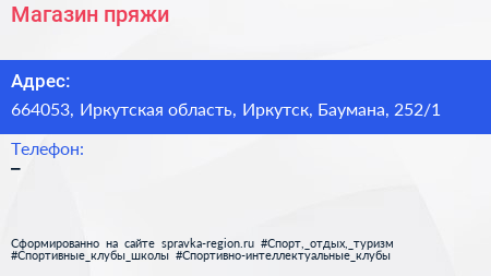 Магазин пряжи по адресу 664053, Иркутская область, Иркутск, Баумана, 252/1 в дальнейшем Организация, размещена в следующих категориях: