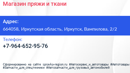 Магазин пряжи и ткани по адресу 664058, Иркутская область, Иркутск, Вампилова, 2/2 в дальнейшем Организация, размещена в следующих категориях: