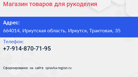 Магазин товаров для рукоделия по адресу 664014, Иркутская область, Иркутск, Трактовая, 35 в дальнейшем Организация, размещена в следующих категориях: