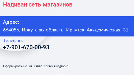Надиван, сеть магазинов по адресу 664056, Иркутская область, Иркутск, Академическая, 31 в дальнейшем Организация, размещена в следующих категориях: