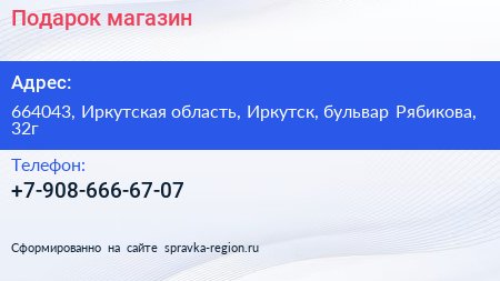 Подарок, магазин по адресу 664043, Иркутская область, Иркутск, бульвар Рябикова, 32г в дальнейшем Организация, размещена в следующих категориях:
