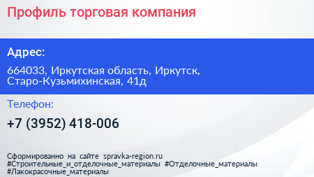 Профиль, торговая компания по адресу 664033, Иркутская область, Иркутск, Старо-Кузьмихинская, 41д в дальнейшем Организация, размещена в следующих категориях: