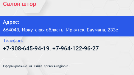 Салон штор по адресу 664048, Иркутская область, Иркутск, Баумана, 233е в дальнейшем Организация, размещена в следующих категориях: