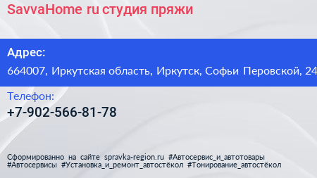 SavvaHome.ru, студия пряжи по адресу 664007, Иркутская область, Иркутск, Софьи Перовской, 24 в дальнейшем Организация, размещена в следующих категориях: