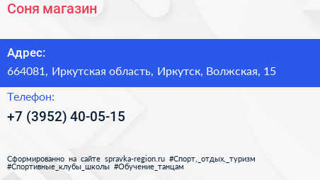 Соня, магазин по адресу 664081, Иркутская область, Иркутск, Волжская, 15 в дальнейшем Организация, размещена в следующих категориях: