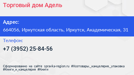 Торговый дом Адель по адресу 664056, Иркутская область, Иркутск, Академическая, 31 в дальнейшем Организация, размещена в следующих категориях: