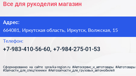Все для рукоделия, магазин по адресу 664081, Иркутская область, Иркутск, Волжская, 15 в дальнейшем Организация, размещена в следующих категориях: